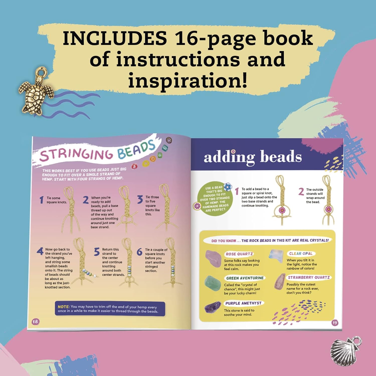 With three colors of hemp, a rainbow of iridescent beads, handmade clay beads, gold and silver charms, and real crystal rock beads, crafters can customize their own creations to suit their style.
