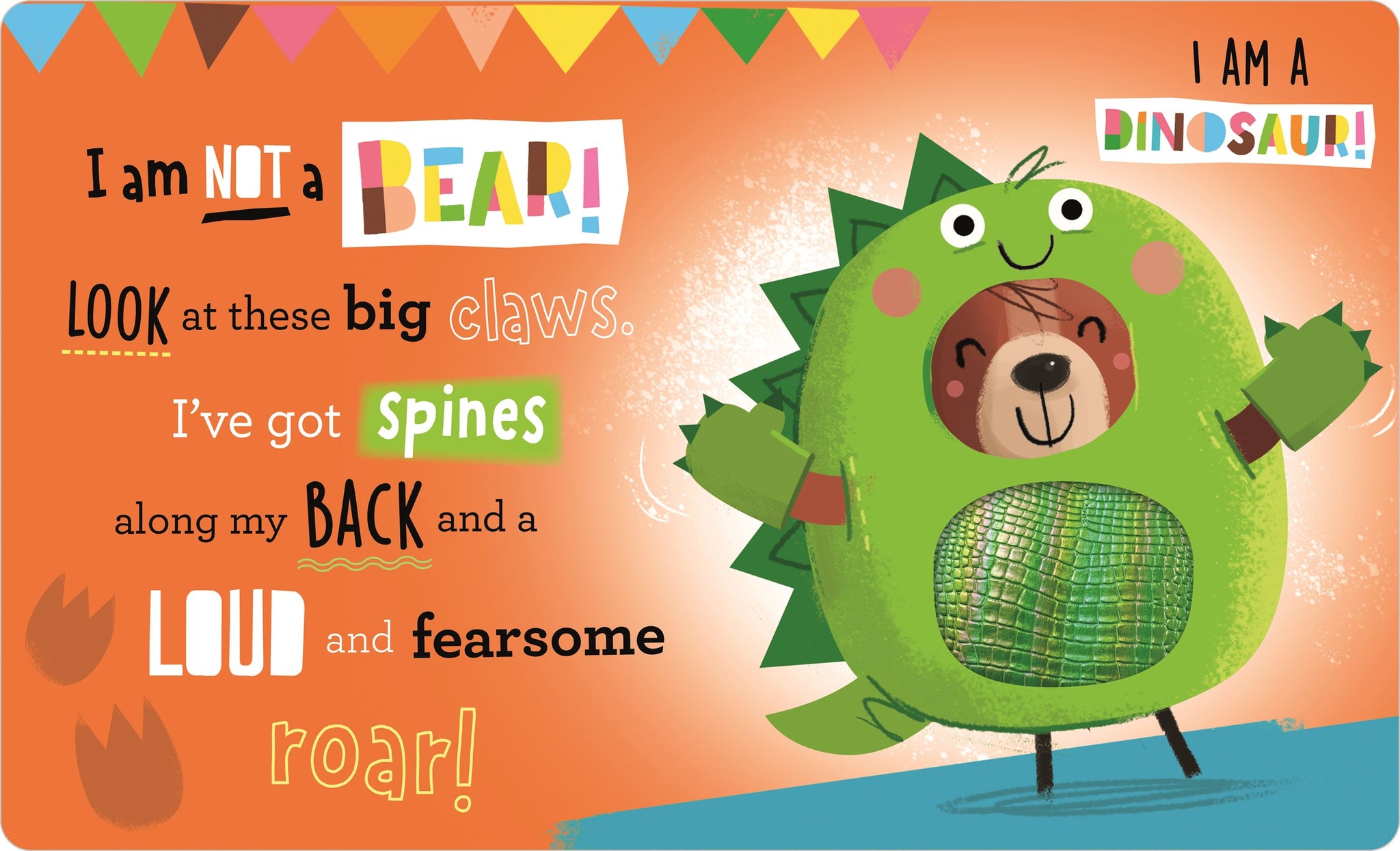 Meet Dinosaur, Bunny, but NOT Bear in this playful touch-and-sound book. With touches that double up as sound buttons throughout, little ones will love watching as Bear disguises himself in different animal costumes and makes their sounds instead of his own. Join the fun as Bear repeats, “I am not a bear!