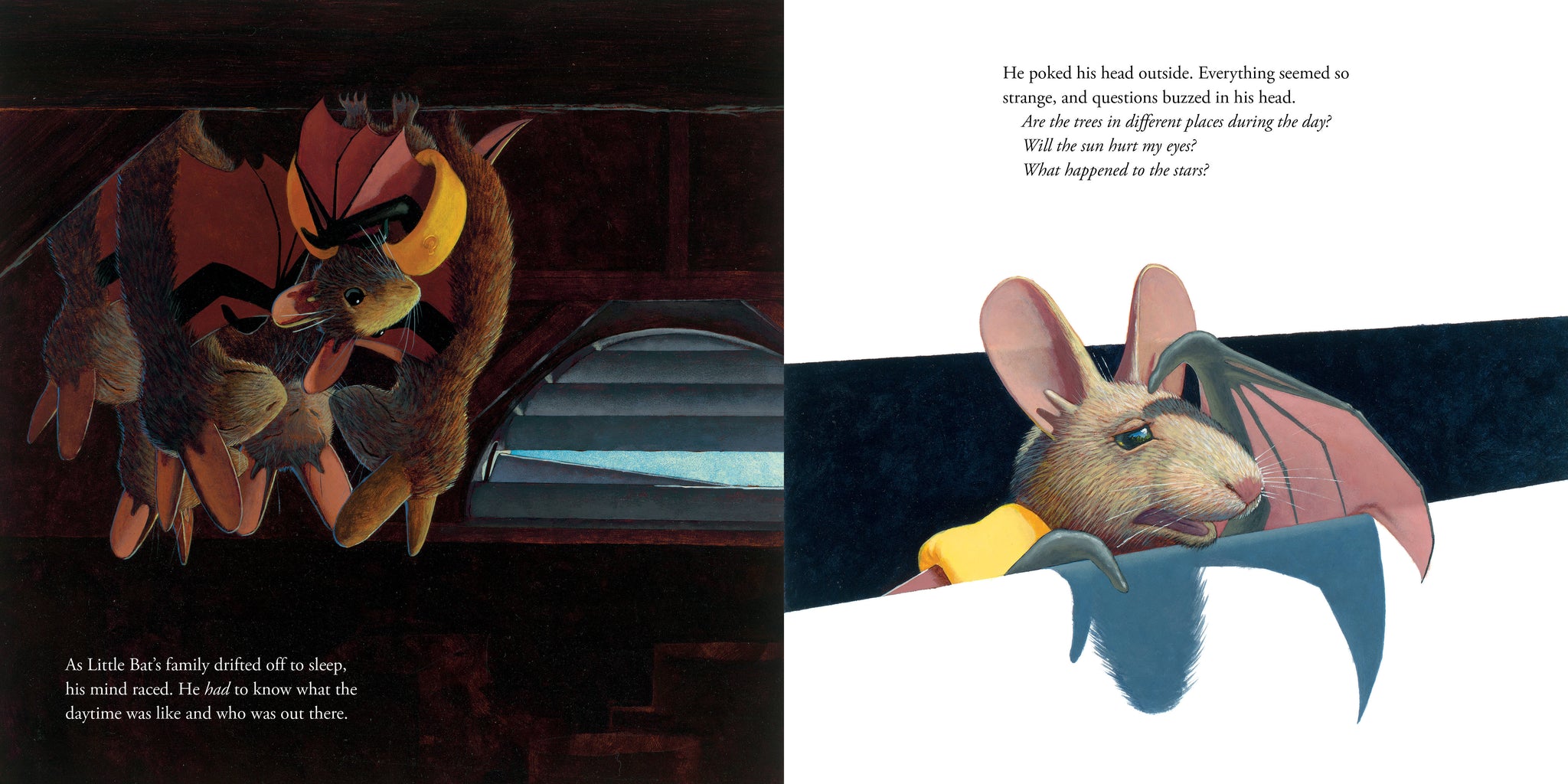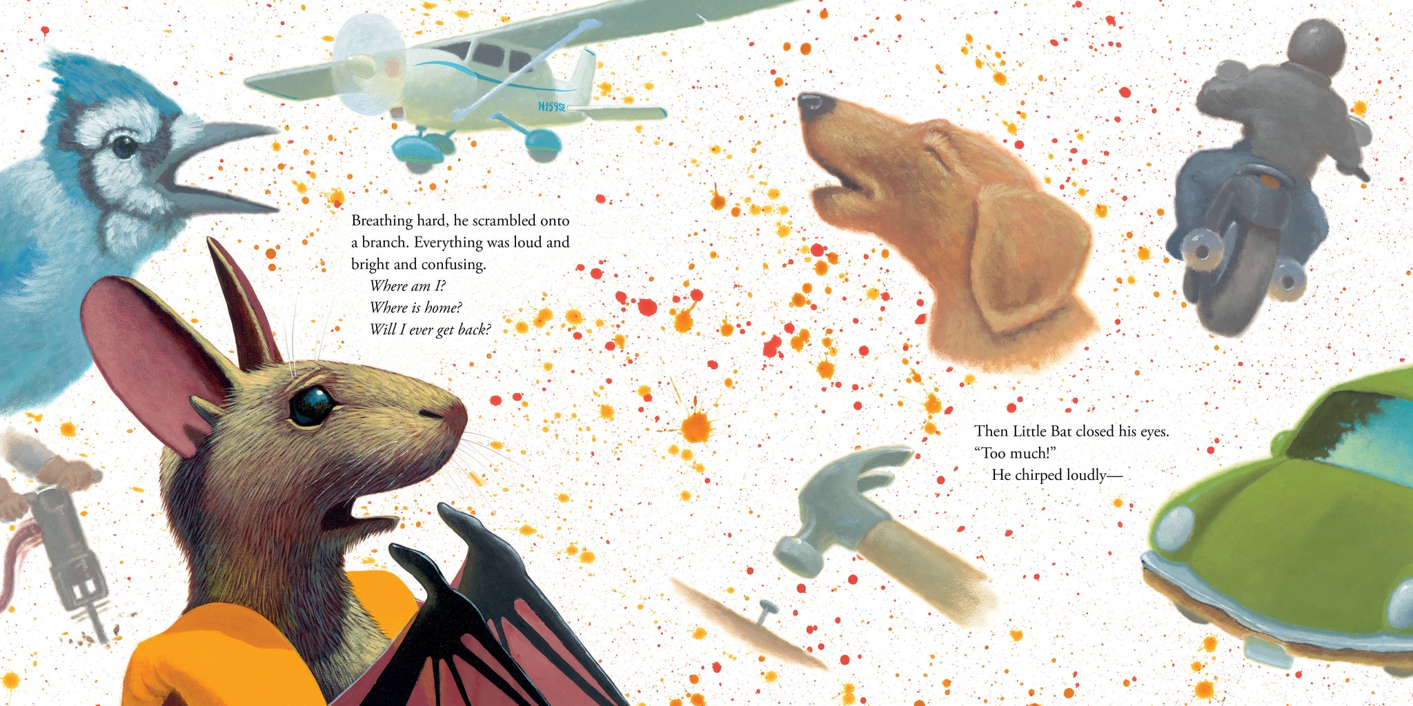 It turns out the world is a much different place during the day, when Little Bat is normally sleeping. It's hot, bright, and noisy. Luckily, Rusty the Squirrel is willing to show Little Bat around. But when these new, fast friends separate at the end of the day, how will they stay in touch when one is usually awake while the other is asleep?