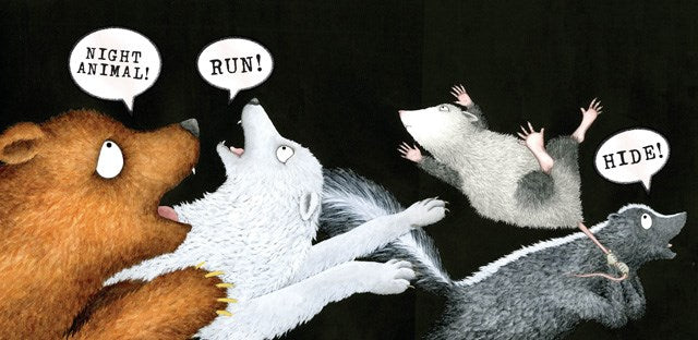 First Possum hears it. Then Skunk. Then Wolf comes running.