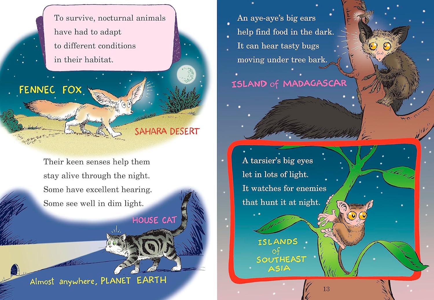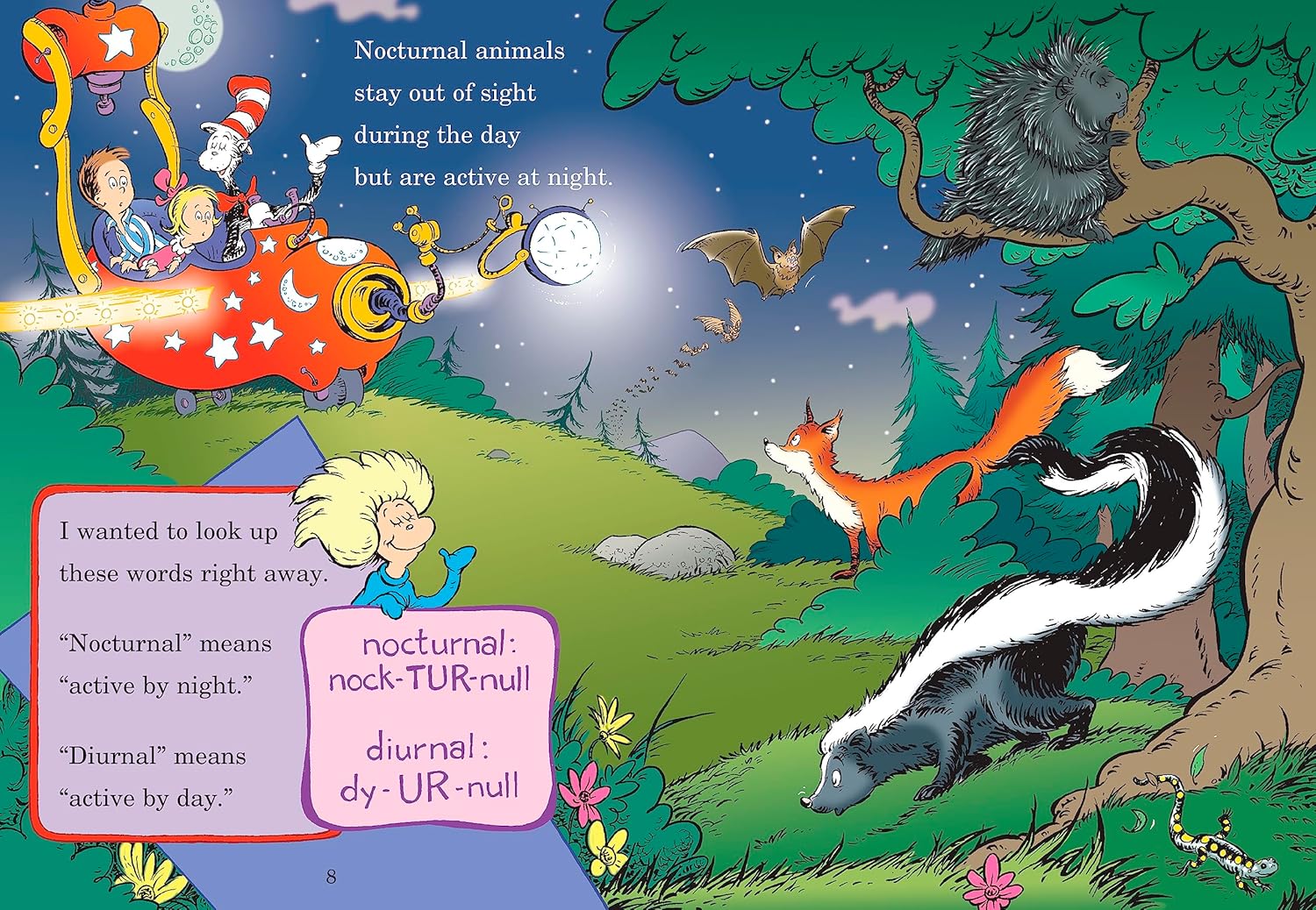 The Cat in the Hat’s Learning Library series combines beloved characters, engaging rhymes, and Seussian illustrations to introduce children to non-fiction topics from the real world! Stay up past your bedtime and discover the world of nocturnal animals, including: