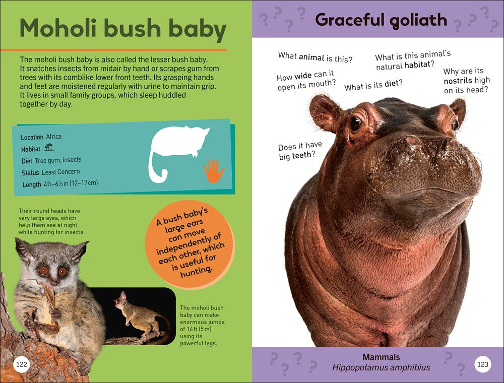 Every creature is shown in beautiful detail, with quiz questions surrounding its portrait. Turn the page to find the answers to the questions—delivered in fast-fact style, including what they eat, where they live, how big they are compared to humans, and more images and facts. A jaw-dropping spectrum of animal types—from fish and birds to reptiles and mammals—provides a learning experience like no other