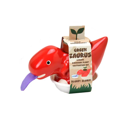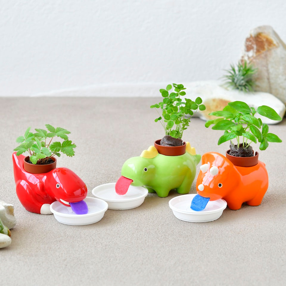 These colorful and cute dino characters have tongues that lap up water and feeds the precious plant on their back.