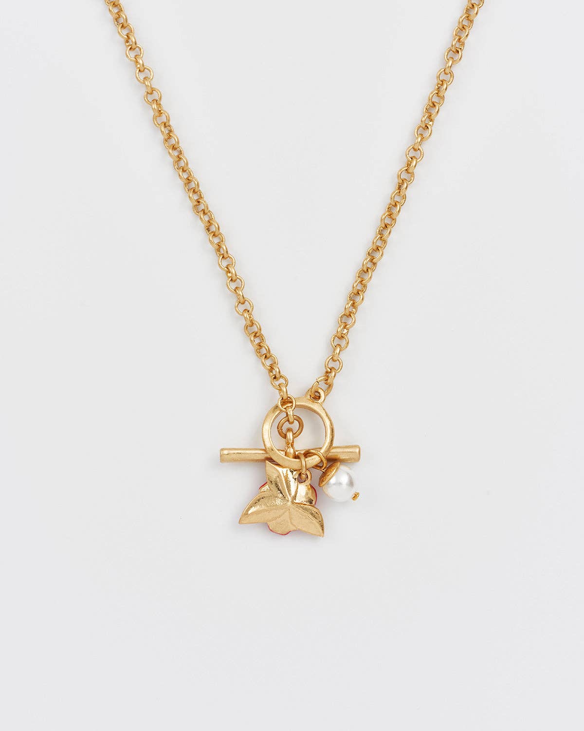 Celebrate the beauty of resilience with the English Rose Pearl Toggle Necklace, a graceful piece inspired by the enduring strength of the English rose, weathering the storm. This romantic necklace captures the essence of a blooming garden with a sculpted red enamel rose and a delicate faux pearl, both elegantly suspended from a vintage-inspired toggle clasp finished in a luxe antique tone.